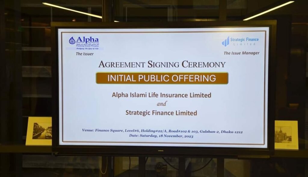 আলফা ইসলামী লাইফ ইন্স্যুরেন্স আইপিওর মাধ্যমে মূলধন বাড়াতে আলফা ইসলামী লাইফ ইন্স্যুরেন্স লিমিটেড (AILIL) সম্প্রতি প্রাথমিক পাবলিক অফারের (আইপিও) মাধ্যমে মূলধন সংগ্রহের সিদ্ধান্ত নিয়েছে। অনুমোদন পেতে কোম্পানিটি বাংলাদেশ সিকিউরিটিজ অ্যান্ড এক্সচেঞ্জ কমিশনে (বিএসইসি) আবেদন করবে। জীবন বীমাকারীর অনুমোদিত মূলধন হল 100 কোটি টাকা, এবং প্রাক-আইপিও পরিশোধিত মূলধন হল 50 কোটি টাকা৷ AILIL বাংলাদেশের বীমা খাতে এক দশকের অভিজ্ঞতা সহ একটি বিশিষ্ট নাম। কোম্পানিটি মোস্ট ইনোভেটিভ শরিয়াহ্ কমপ্লায়েন্ট লাইফ ইন্স্যুরেন্স কোম্পানি-2022 (দ্য গ্লোবাল ইকোনমিক্স, লন্ডন, ইউকে দ্বারা) এবং সেরা ইসলামী লাইফ ইন্স্যুরেন্স (বাংলাদেশ পণ্য প্রদর্শনী-2023, কেএসএ দ্বারা) এর মতো কিছু মর্যাদাপূর্ণ পুরস্কারের সাথেও স্বীকৃত হয়েছে। AILIL 18 নভেম্বর, 2023 তারিখে সংশ্লিষ্ট কোম্পানির প্রধান নির্বাহী কর্মকর্তাদের দ্বারা স্বাক্ষরিত একটি চুক্তির মাধ্যমে ইস্যু ম্যানেজার হিসাবে কাজ করার জন্য BSEC দ্বারা লাইসেন্সপ্রাপ্ত একটি মার্চেন্ট ব্যাংক স্ট্র্যাটেজিক ফাইন্যান্স লিমিটেড (SFL) নিযুক্ত করেছে। এআইএলআইএল-এর চেয়ারম্যান জনাব আলমগীর শামসুল আলামিন, এআইএলআইএল-এর ভাইস চেয়ারম্যান জনাব মুহাম্মদ সাঈদ, জনাব নুরা আলম সিদ্দিকী অভী, প্রধান নির্বাহী কর্মকর্তা এবং রুবেল চন্দ্র পাল, এআইএলআইএল-এর শেয়ার ও বিনিয়োগ প্রধান, ড. চৌধুরী নাফিজ সরাফাত, জনাব ড. স্ট্র্যাটেজিক হোল্ডিংস-এর গ্রুপ সিইও এহসানুল কবির, এসএফএল-এর ব্যবস্থাপনা পরিচালক অসিত কুমার চক্রবর্তী, এসএফএল-এর প্রধান নির্বাহী কর্মকর্তা জনাব মুহাম্মদ কবির সাদিক এবং উভয় প্রতিষ্ঠানের অন্যান্য উচ্চপদস্থ কর্মকর্তারা অনুষ্ঠানে উপস্থিত ছিলেন।